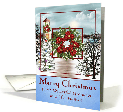 Fun facts: The traditional idea of a Christmas wreath has become a popular Christmas decoration and they started being hung on doors by the 1900s, and are now commonly found on doors. The making of Christmas wreaths is a common Christmas craft activity and the base can be made from wire, styrofoam, cane or other material, and other supplies can include fabric. Wish your wonderful grandson and his fiancée a Merry Christmas with a card featuring a lighthouse scene with snow, a Christmas Tree, icy water and mountains against a beautiful blue sky. Design is framed in burgundy lines with snowflakes and burgundy text. Design by Laurie Schneider, elements by Digital Designs by Elena, Diana'z Designz.