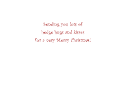 A cute little hedgehog holding a candy cane and a Christmas ornament sitting on a bed of evergreen branches surrounded by snow on a starry night. Inside message reads: "Sending you lots of hedge hugs and kisses for a very Merry Christmas! " Inside message may be changed by you.
