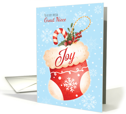 A sweet, chubby little stocking adorned with a snowflake and stuffed with Christmas joys is the simple greeting a special great niece will love this holiday season. With a pale blue background and fluttering snowflakes, she can almost hear the sleigh bells ringing! Send this card to wish her all the joy of the season! Merry Christmas.