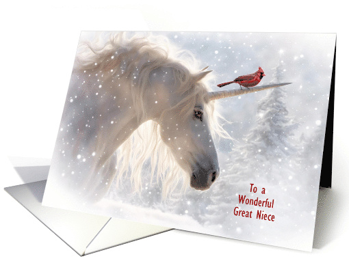 Great or grandniece this card can be change to reflect your preference. A magical winter scene with a pretty white unicorn in the snow.