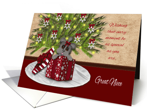 Wishing that every moment is that every moment be as special as you are, Great Niece. An adorable yorkie puppy in a christmas present with a christmas tree adorned with white snowflakes and little red bows.Inside message says: " Merry Christmas! " Inside message may be changed by you