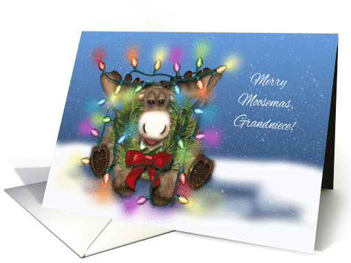 Merry Moosemas, Grandniece. Silly moose with a wreath around his neck sitting in the snow all tangled in Christmas lights. Inside messages says: " With love and best wishes, for a Merry Christmas! " Inside message may be changed by you