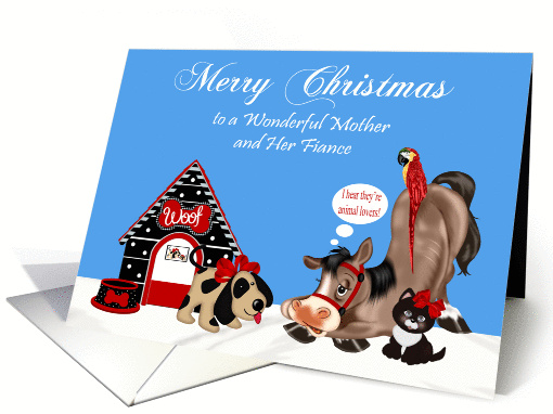 | Artist Notes: | Wish your mother and her fiance Merry Christmas with a card featuring an adorable dog, parrot, horse and cat in the snow talking about animal lovers against a blue sky. The dog and cat have bows and the cute horse has a harness. Inside like all GCU cards can be personalized by you. |