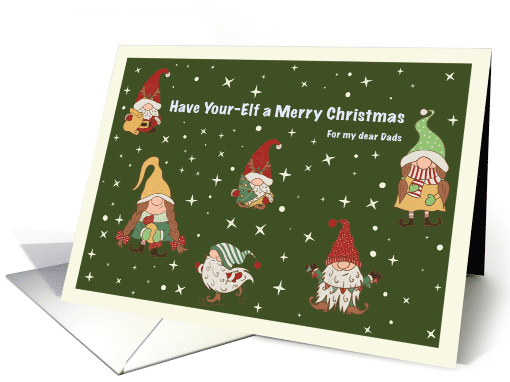 A charming Christmas card featuring six whimsical gnomes dressed in festive hats and cozy winter clothes, surrounded by stars and snow on a dark green background. The front message reads "Merry you a whimsical Christmas“ for dads