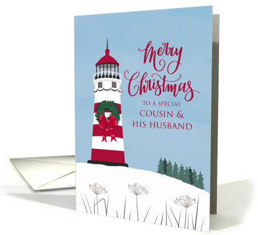 A beautiful illustration of a lighthouse with a huge Christmas wreath with the words Merry Christmas to a special cousin and his husband on the front of the card. © Ness Nordberg