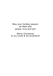 Christmas items such as holly, snowflakes, presents, mistletoe, pine trees, bows and hearts decorated in a bauble ornament shape with a dove in the middle. The words 'Merry Christmas' is created with Ness Nordberg's unique hand lettering. A lovely Christmas card to send to your uncle and his boyfriend.