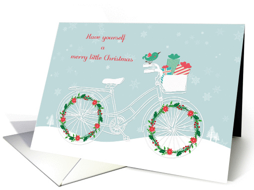 | Artist Notes: | This Christmas greeting features a white bicycle decorated for Christmas. There is a basket filled with gifts and the wheels are embellished with wreaths made of holly and poinsettias against a snowy winter background. A little bird sits on the handlebars. This card is perfect for a cyclist or for anyone who enjoys a bit of whimsy. |