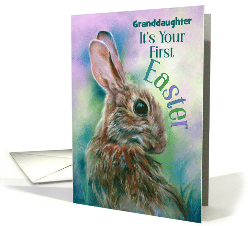 This first Easter greeting, perfect for a granddaughter or any special relationship, features a charming brown bunny rabbit in soft pastel tones, set against a backdrop of blue, green, and purple grasses.