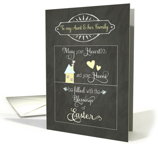 | Artist Notes: | Wish your aunt and her family a happy Easter with this sweet and trendy Christian card featuring a house, hearts and the text: "may your heart and home be filled with the blessings of Easter" on a chalkboard effect background. You can edit text inside card. Custom requests welcome. |