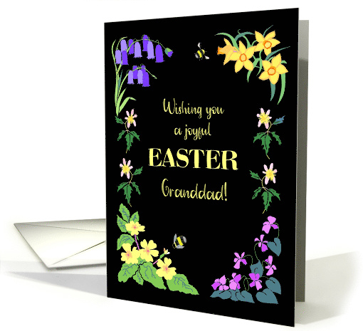 A pretty Easter card for your grandfather, with a border of spring flowers on a black background. There are bluebells, wild daffodils, wood violets and primroses in the corners and wood anemones at the sides, with bumble bees hovering near the flowers. The front cover greeting is, 'Wishing you a joyful EASTER Granddad!', in a handwritten font and a bold capital letters.', in pale yellow lettering, all on a black background. The inside message is just a suggestion and you can easily change it or delete it if you prefer a 'blank inside' card.