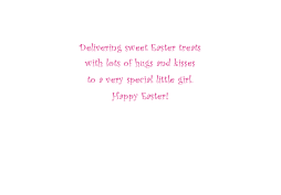 An adorable pink bunny wearing green striped ruffled tutu with a big pink bow pulling a wagon full of Easter basket goodies. Beautiful yellow, pink and purple tulips surrounded by green grass On a pastel purple watercolor background. Inside message reads: " Delivering sweet Easter treats with lots of hugs and kisses to a very special little girl. Happy Easter ( you can insert child's name on inside verse)!" Inside message may be changed by you.
