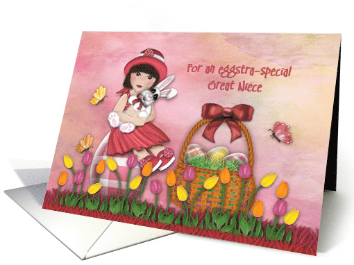 This adorable little Asian girl with her Easter hat, is sitting on a gingham Easter egg holding a cute white bunny and butterflies flying around. The scene is set in a garden of pink, orange and yellow tulips with a large basket of colored eggs. Inside message reads: "Wishing you an Easter that is as special as you! Happy Easter " Inside message may be changed by you.