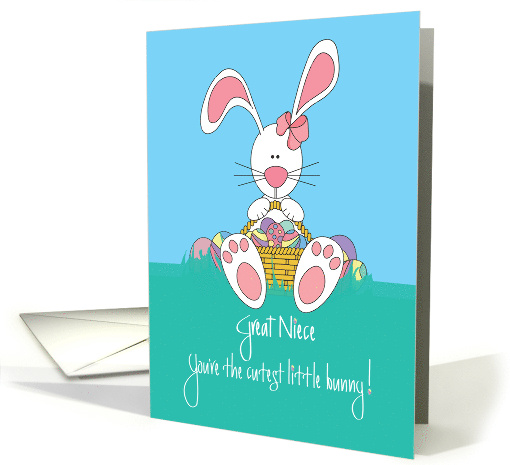 "Great Niece - You're the Cutest Little Bunny!" is the hand lettered wording, that is written across the green grass, at the bottom of this delightfully cute Easter card. Above, a white bunny, wearing a pink bow on one of her ears, holds a woven basket of decorated Easter eggs between her huge hind pink and white feet that are sticking out in front of her. Several other striped and colored eggs sit by each of her sides. The inside wording of the card says "Delivering hugs, kisses and Easter wishes just for you!"