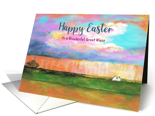 This Easter holiday, surprise your Great Niece with a beautifully illustrated card featuring a countryside landscape—a cozy home, golden fields, and an approaching rainstorm.