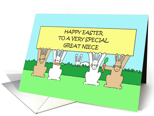 An illustration of five bunnies in a field, eating carrots and holding up a lemon coloured sign that says 'Happy Easter to a very special great niece'.