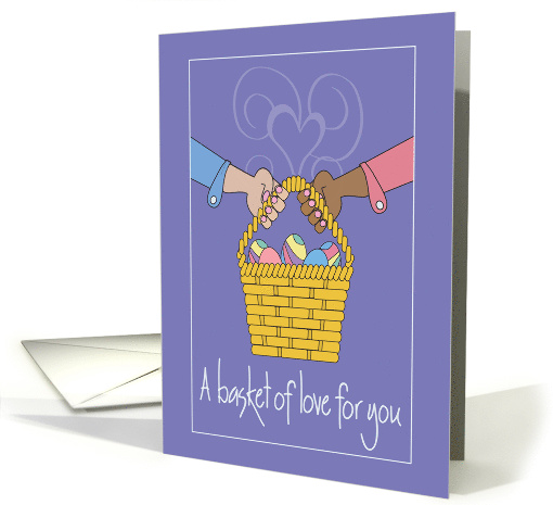 Wish your very special boyfriend a Happy Easter with this spring-colored Easter card this year. Two arms reach in from both sides of the deep lavender card, one with a pink shirt on and one with a blue shirt on, as they both hold a woven Easter basket, overflowing with decorated Easter eggs. A scrollwork design fills the background, above the basket, which includes a heart. Below the shared basket, hand lettered wording says "A basket of love for you". The inside wording of the card says "Happy Easter to my wonderful boyfriend."