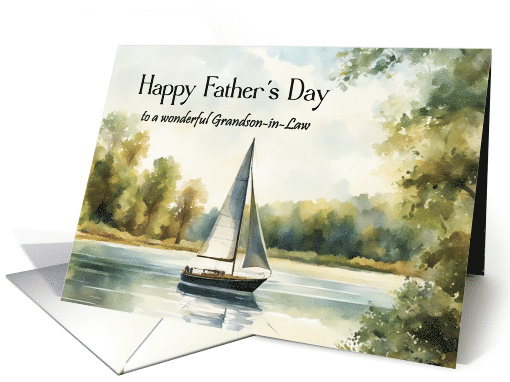 Happy Fathers Day for Grandson in Law. Serene watercolor painting of a sailboat on a sunlit lake surrounded by trees, with classic mixed typography. Some of the artwork was AI generated, all other elements of the design were created and edited by the artist.