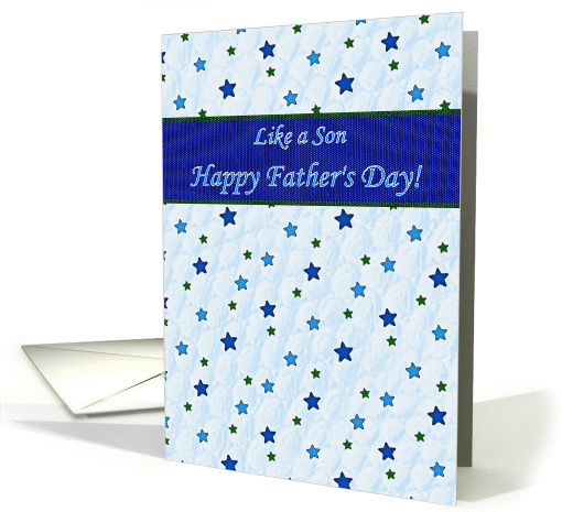 | Artist Notes: | This card has a light blue like snake skin textured pattern, tiny blue stars in various sizes, a navy blue tiled stripe, and the phrases: "Like a Son" and "Happy Father's Day!" |