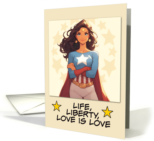 | Artist Notes: | A female superhero wearing a stars and stripes outfit on a beige background and the text "life, liberty, love is love". A powerful design for a red-blooded gay american, or gay ally, to celebrate the birthday of the United States of America with a special message. |