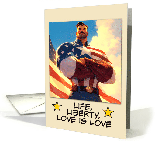 | Artist Notes: | A male superhero wearing a stars and stripes outfit on a beige background and the text "life, liberty, love is love". A powerful design for a red-blooded gay american, or gay ally, to celebrate the birthday of the United States of America with a special message. |