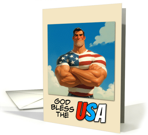 | Artist Notes: | A muscled hunk wearing a stars and stripes shirt on a beige background and the text "God Bless the USA". A powerful design for a red-blooded gay american, or gay ally, to celebrate the birthday of the United States of America with a special message. |