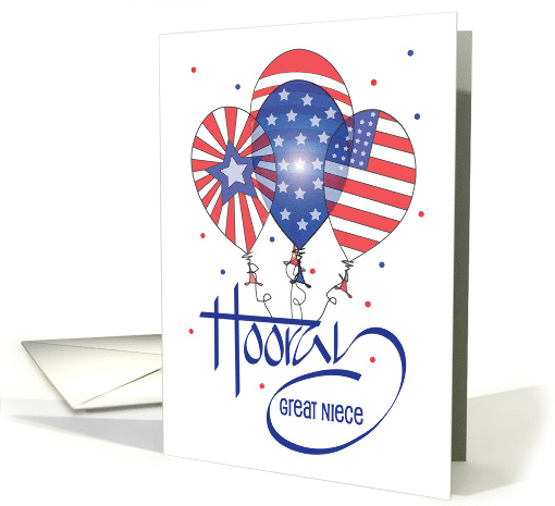 Stars and stripes in red, white and blue make this wonderfully festive Fourth of July card for your Great Niece one that you will definitely want to share with each of your Great Nieces this year. Every one of the five balloons duplicate portions of our American flag with their unique displays of red and white stripes and combinations of blue and white stars. The confetti that surrounds the balloons displays the same bright patriotic colors. Swirling across the bottom of the card, below the inflated balloons, is the enormous single hand lettered word "Hooray", with "Great Niece" tucked neatly in the curl of the last letter. The inside wording of the card says "Let's celebrate our country's birthday! Happy 4th of July!"