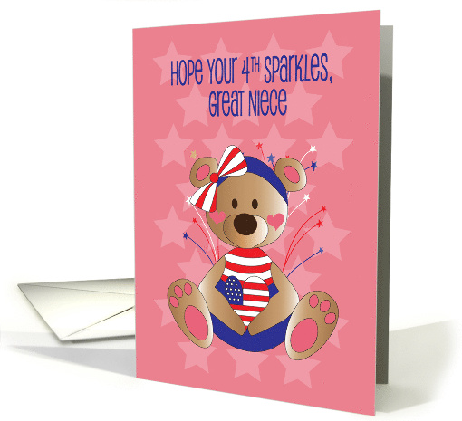 All of your little Great Nieces will adore receiving this fun Fourth of July card's patriotically dressed bear from you this year. She sits with her huge hind feet sticking out in front of her, as she prepares for July 4th by wearing her jumper made of red and white stripes and solid navy blue. Her little headband matches, with a huge red and white striped bow attached. A heart made like our flag, with a blue section with white stars and red and white stripes, is being held by the little brown bear, with an explosion of light stars and fireworks filling the background behind her. The card's inside wording says "Sending you love and fun for a sparkling Fourth of July!"