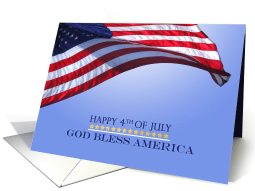 God bless America this 4th of July. A very patriotic and stirring image of the American flag flying in the breeze against a clear blue sky. Perfect card to send your fourth of July greetings to friends and family in support of this great country on this Independence Day. The inside verse contains a special prayer: May God Bless our Troops, May God Bless our Homes and Loved Ones, and May God Bless our Liberty and Freedom! A universal prayer appropriate for many faiths of all denominations. Design © PamJArts