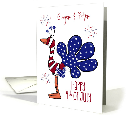 Artist Notes: | ©Christie Black. Whimsical peacock with red and white striped body and blue tail with stars. Firework shapes are in the background. Caption says Happy 4th of July and you can customize with any name or names on the front. |