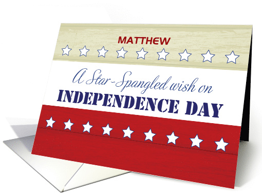Celebrate the Fourth of July with this patriotic and customizable design featuring red, white, and blue rustic wood-style panels and bold star accents. The front includes the cheerful message “A Star-Spangled wish on Independence Day” with space to personalize a name for a special touch. With its all-American flair and thoughtful inside message, this card is perfect for sending warm wishes to friends, family, or anyone who loves the spirit of freedom, fireworks, and patriotic pride. A festive way to honor the day and show you’re thinking of them.