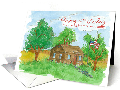 | Artist Notes: | Happy 4th of July to special brother and family greeting card decorated with a country cabin landscape watercolor painting with a patriotic flag waving in the wind in the front yard. |