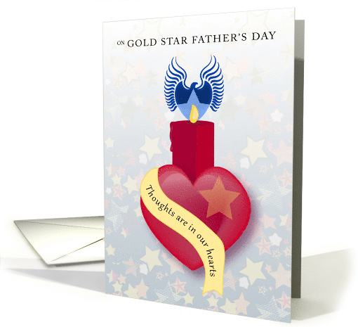Artist Notes: | Illustrated Gold Star Father's Day card. A red lit candle with a calligraphy heraldry eagle behind the flame. The shield of the eagle has a star. At the bottom of the candle is a large puffy heart with a gold star at the shoulder. A sash or ribbon is around the heart with the phrase: "Thoughts are in our hearts". |