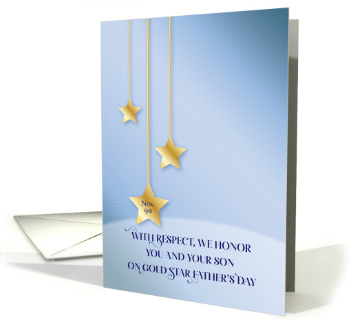 Artist Notes: | Give this Gold Star Father's Day card to a father who lost a son. The date of November 9th is on the biggest star. There are three stars hanging against a soft blue background. (No gold ink is used in printing) The dark blue headline is located at the bottom of the card. You may change the inside message, if you wish. ©Gail Pepin |