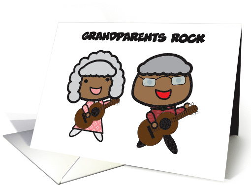 | Artist Notes: | Are you looking for a cute and funny Grandparents Day card that allows you to change and personalize both the cover and inside greeting card text? This kawaii grandparent design has a black grandmother wearing a pink dress and a black grandfather wearing glasses and a plaid shirt. Both play guitar. The cover text says, "Grandparents Rock" and the inside text says, "Happy Grandparents Day!" |