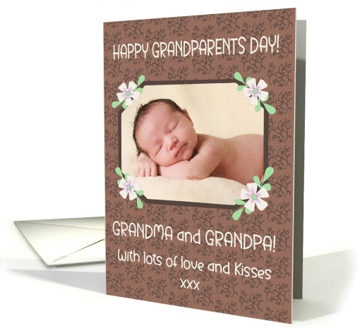 | Artist Notes: | You can customize this trendy Grandparents Day greeting card for your grandparents by uploading your photo to make it really special! The front cover greeting, in white, informal lettering, is, 'HAPPY GRANDPARENTS DAY! and 'GRANDMA and GRANDPA! With lots of love and kisses! xxx'. The background is a pattern of tiny dark chocolate flowers on a mocha coloured background. The inside message is just a suggestion and you can change it or delete it if you prefer a 'Blank Inside' card. |