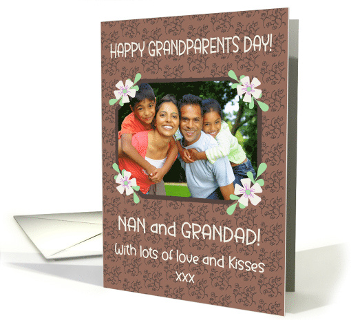 | Artist Notes: | You can customize this trendy Grandparents Day greeting card for your grandparents, by uploading your photo to make it really special! The front cover greeting, in white, informal lettering, is, 'HAPPY GRANDPARENTS DAY! and 'NAN and GRANDAD! With lots of love and kisses! xxx'. The background is a pattern of tiny dark chocolate flowers on a mocha coloured background. The inside message is just a suggestion and you can change it or delete it if you prefer a 'Blank Inside' card. |