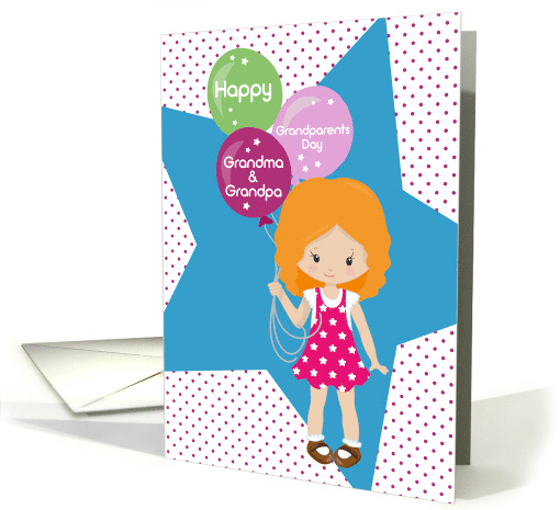 | Artist Notes: | This whimsical Happy Grandparents Day to Grandma and Grandpa design features a young girl holding a bunch of colorful balloons. The background is a bold green star and a pattern of polka dots. |