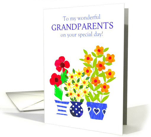 | Artist Notes: | A pretty Grandparents Day Card, with three pots of colourful flowers, from a digital capture of a hand painted paper collage by Judy Adamson. The greeting on the front cover is, 'To my wonderful GRANDPARENTS on your special day!' in blue lettering on the white background. |