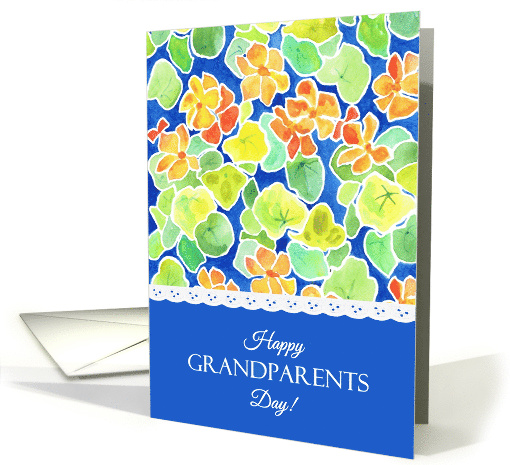 | Artist Notes: | A colourful Grandparents Day greeting card, with a pretty pattern of orange and scarlet nasturtiums on a bright blue background, from a hand-painted design by Judy Adamson. The nasturtiums pattern is edged with faux broderie anglaise (lace-effect) and below that is the greeting, 'Happy GRANDPARENTS Day' in white lettering on bright blue. The inside message is just a suggestion which you can easily change or delete if you prefer. |