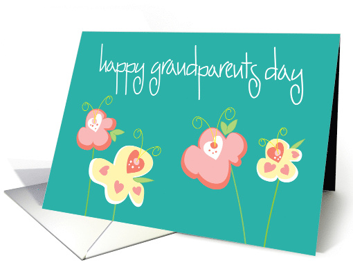 | Artist Notes: | "Happy Grandparent's Day" is the whimsically fun white hand lettered wording across the top of this bright teal Grandparent's Day card for your Grandma and Grandpa together. They will both enjoy receiving this card on the special holiday known as Grandparent's Day from you, with the heart flowers that decorate the front of the card, created with tiny hearts in each flower. The inside wording of the card says "You are so special to us, Grandma and Grandpa! We love you!" |