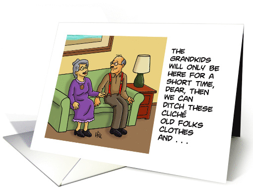 | Artist Notes: | Humorous Grandparents Day card with a cartoon older couple on a sofa. The words say: The grandkids will only be here for a short time, Dear, then we can ditch these cliché old folks clothes and . . . Inside says: . . . still catch the rock concert tonight! Happy Grandparents Day Grandma and Grandpa! You still rock! |