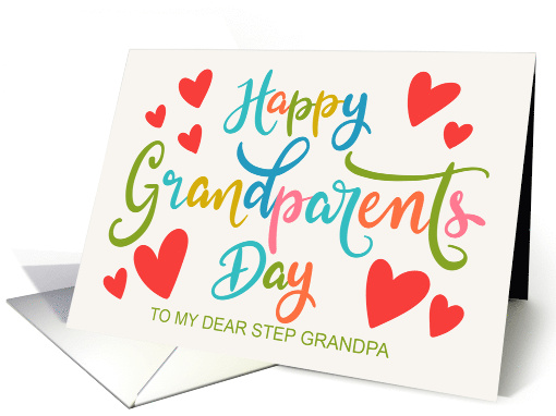 A colorful card with the playful hand lettered words 'Happy Grandparents Day' surrounded by hearts for your step grandpa. © Ness Nordberg