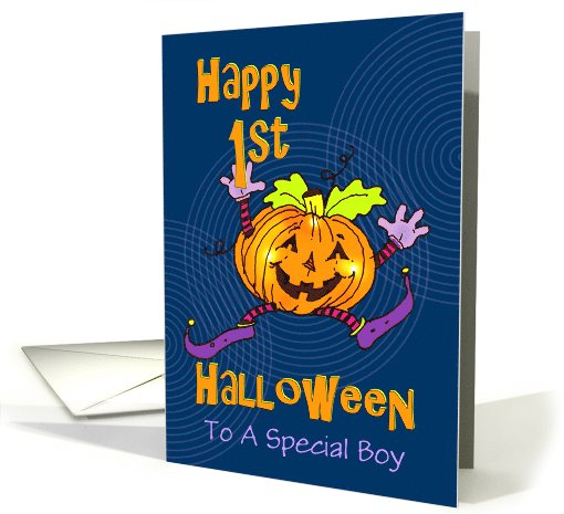 | Artist Notes: | A happy, smiling pumpkin, with violet shoes and gloves, jumping joyfully on this happy 1st Halloween greeting for a special little boy. Text may be personalized with child's name to make it an extra special treat. |