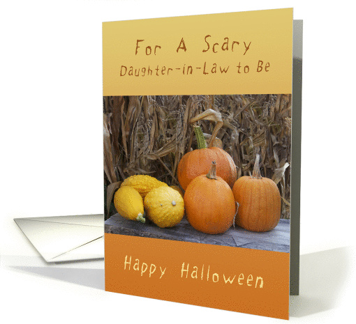 You love your scary Future Daughter-in-Law and enjoy giving her a hard time, she will enjoy this card designed for her. The colorful pumpkins and squash against the corn stalks in the background create a pleasant and eye catching Halloween image.
