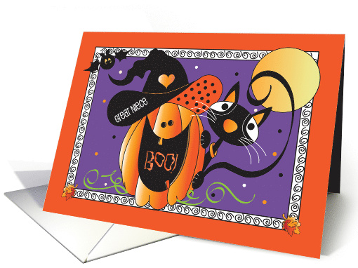 Your Great Niece will love this darling Halloween card, with its black kitty, with a long and thin neck, who is looking around the side of a chubby orange jack o' lantern. The pumpkin wears an orange polka dot witch hat that is black with an orange heart and dots. The kitty's tail rolls around in front of the right upper corner's full moon and a small black bat flies in the opposite corner. A double border brightens the card with orange and black swirls. The inside wording of the card to your sweet Great Niece says "A great big boo to you for a Happy Halloween filled with fun, sweetheart!"