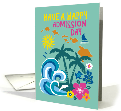 Hawaiian Admission day also known as Statehood day greeting card with a collage of Hawaiian type graphics. The Hawaiian Islands on a turquoise background with palm trees, ocean waves, flowers, a dolphin and turtle.