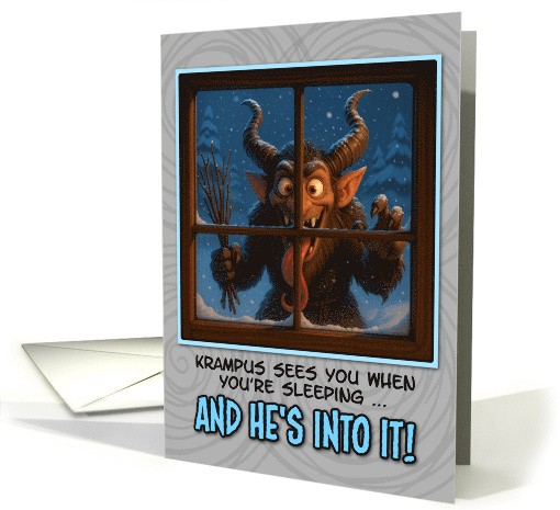 This is a humorous holiday card featuring Krampus, the horned creature from Alpine folklore shows Krampus peering through a four-paned window on a snowy winter night. He has the classic Krampus features - large curved horns, pointed ears, wild hair, fangs, and a mischievous grin with his tongue hanging out. He's holding birch branches (traditionally used by Krampus for swatting naughty children) and has his clawed hands pressed against the glass. The text reads "KRAMPUS SEES YOU WHEN YOU'RE SLEEPING..." at the top in black letters, followed by "AND HE'S INTO IT!" in large, bold blue letters at the bottom. This is a playful twist on the classic "Santa Claus is Coming to Town" lyrics, but with a decidedly more mischievous and slightly inappropriate twist that plays into Krampus's reputation as the "anti-Santa" figure who deals with naughty children during the Christmas season.