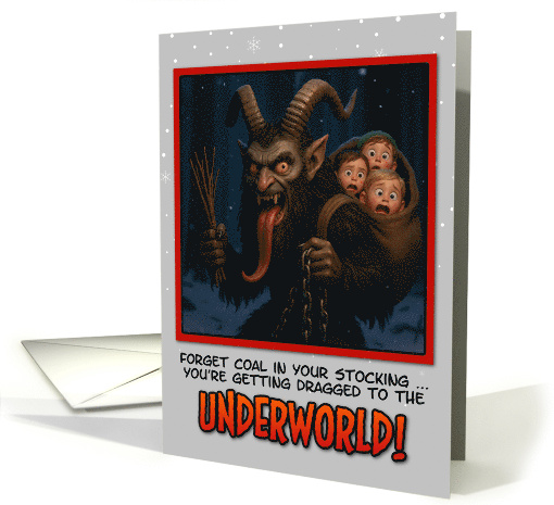 This Krampus card depicts the traditional folklore more literally and dramatically. It shows Krampus in a snowy night scene carrying away three terrified children in a large woven basket or sack on his back. Krampus with his signature curved horns, pointed ears, and fierce expression with yellow eyes and long red tongue. Dark fur covering his body. He's holding his bundle of birch branches (ruten) in one hand and chains in the other. Three children with wide, frightened eyes peering out from the basket. Snow falling against a dark blue night sky. The card has a red border with snowflakes scattered around the frame. The text reads: "FORGET COAL IN YOUR STOCKING... YOU'RE GETTING DRAGGED TO THE UNDERWORLD!" with "UNDERWORLD!" in large orange horror-style lettering. This card references the traditional Krampus legend where the creature would carry away particularly naughty children in his basket, supposedly taking them to his lair or the underworld.