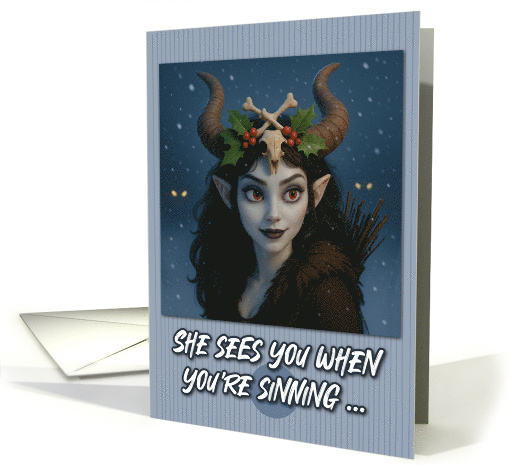 This card presents a more mystical and folkloric interpretation of Lady Krampus with distinct winter and nature themes. The image has an ethereal, almost fairy-tale quality to it. Large curved horns adorned with festive holly leaves and red berries, creating a natural Christmas crown. Pointed ears and striking amber/orange eyes that seem to glow. Pale, almost ethereal skin with dark hair flowing around her shoulders. A bundle of birch branches (ruten) visible over her shoulder. The text reads "SHE SEES YOU WHEN YOU'RE SINNING..." in white letters, playing on the classic "Santa Claus is Coming to Town" lyrics but with a darker twist - substituting "sinning" for "sleeping." This version blends traditional Krampus elements with nature spirit and winter goddess imagery. She appears more like a forest deity or pagan figure who watches over moral behavior, combining the surveillance aspect of Santa with the disciplinary role of Krampus, but presented in a more mystical, less threatening way.