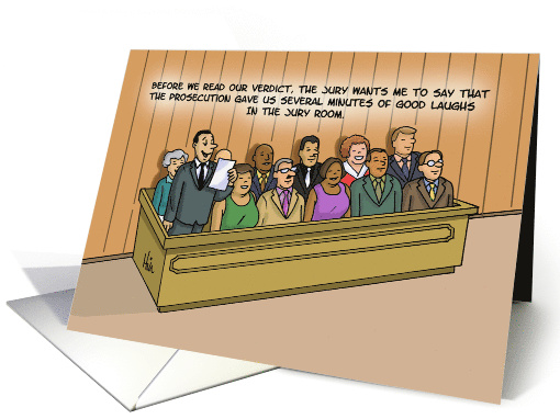 | Artist Notes: | Humorous Law Day card with a cartoon showing a jury foreman saying, Before we read our verdict, the jury wants me to say that the prosecution gave us several minutes of good laughs in the jury room. Inside says, Celebrating Law Day, reflecting on the role of law in our society. |